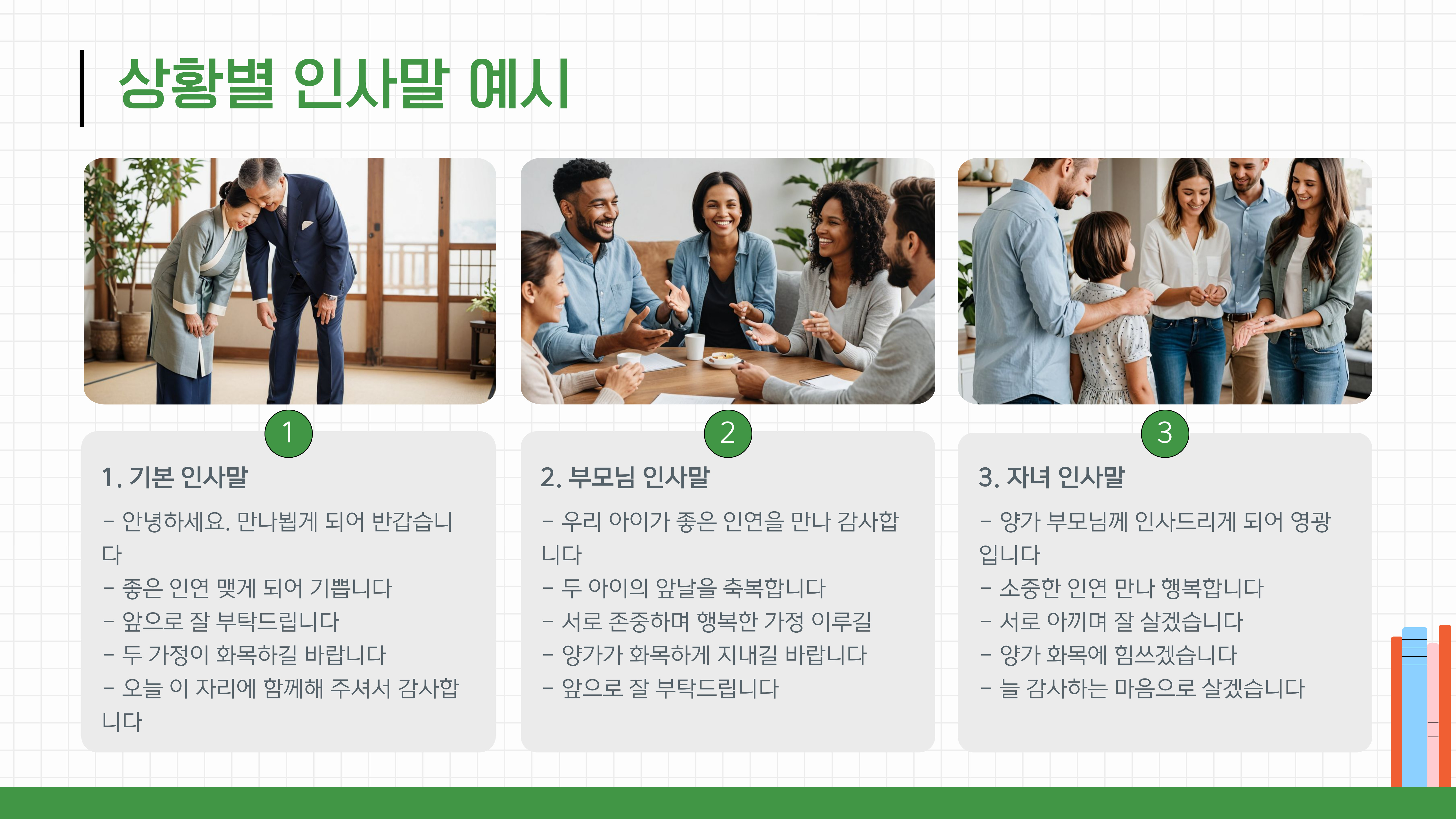 - 상대방의 성향 고려: 상대방 가족이 보수적인지, 개방적인지 등을 사전에 파악해 이에 맞춰 인사말을 조정하는 것이 좋습니다.
