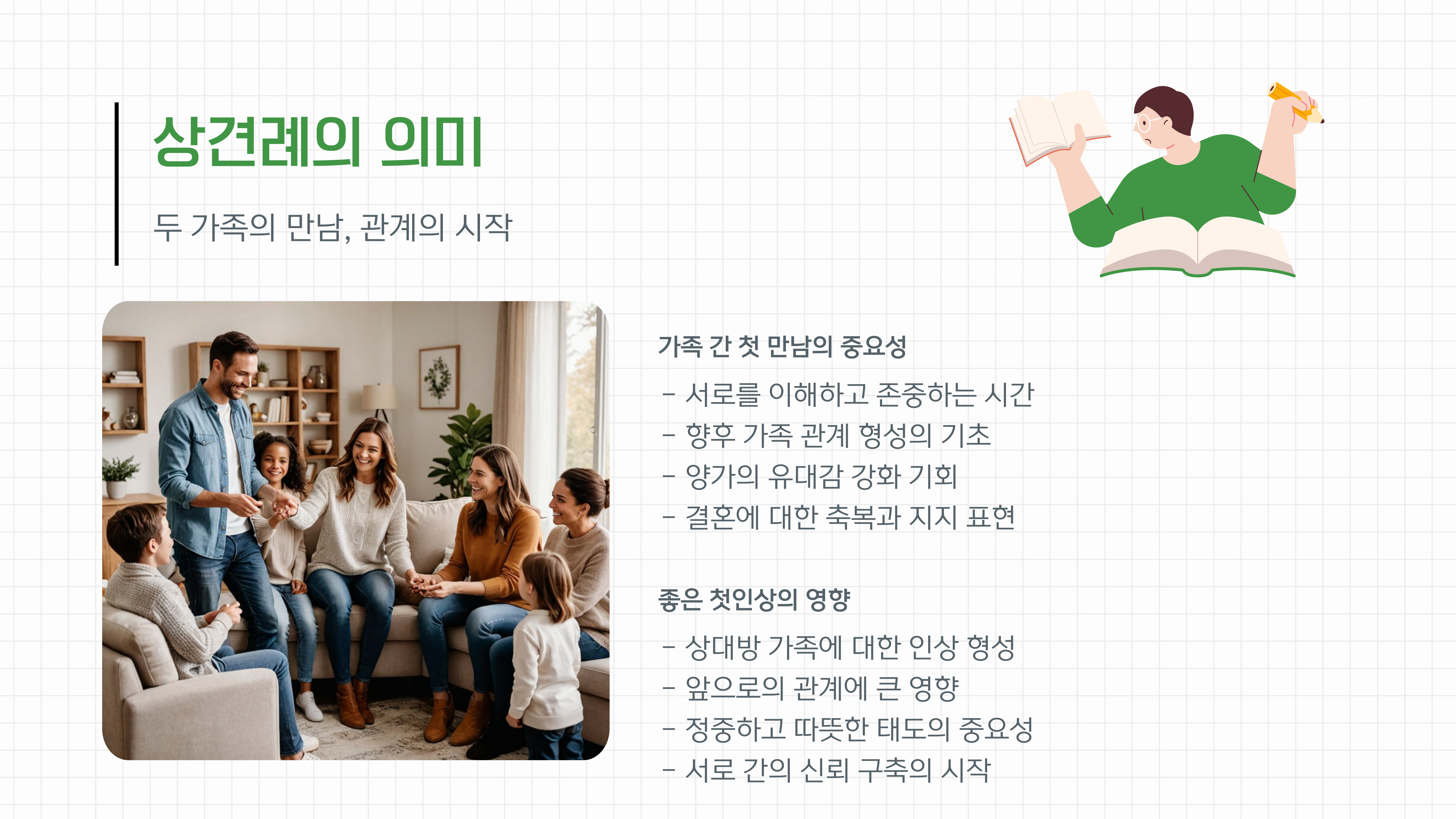 - 가족 간 첫 만남: 상견례는 결혼을 앞두고 양가 가족이 처음으로 인사하는 자리로, 서로를 이해하고 존중하는 시간이 되어야 합니다.