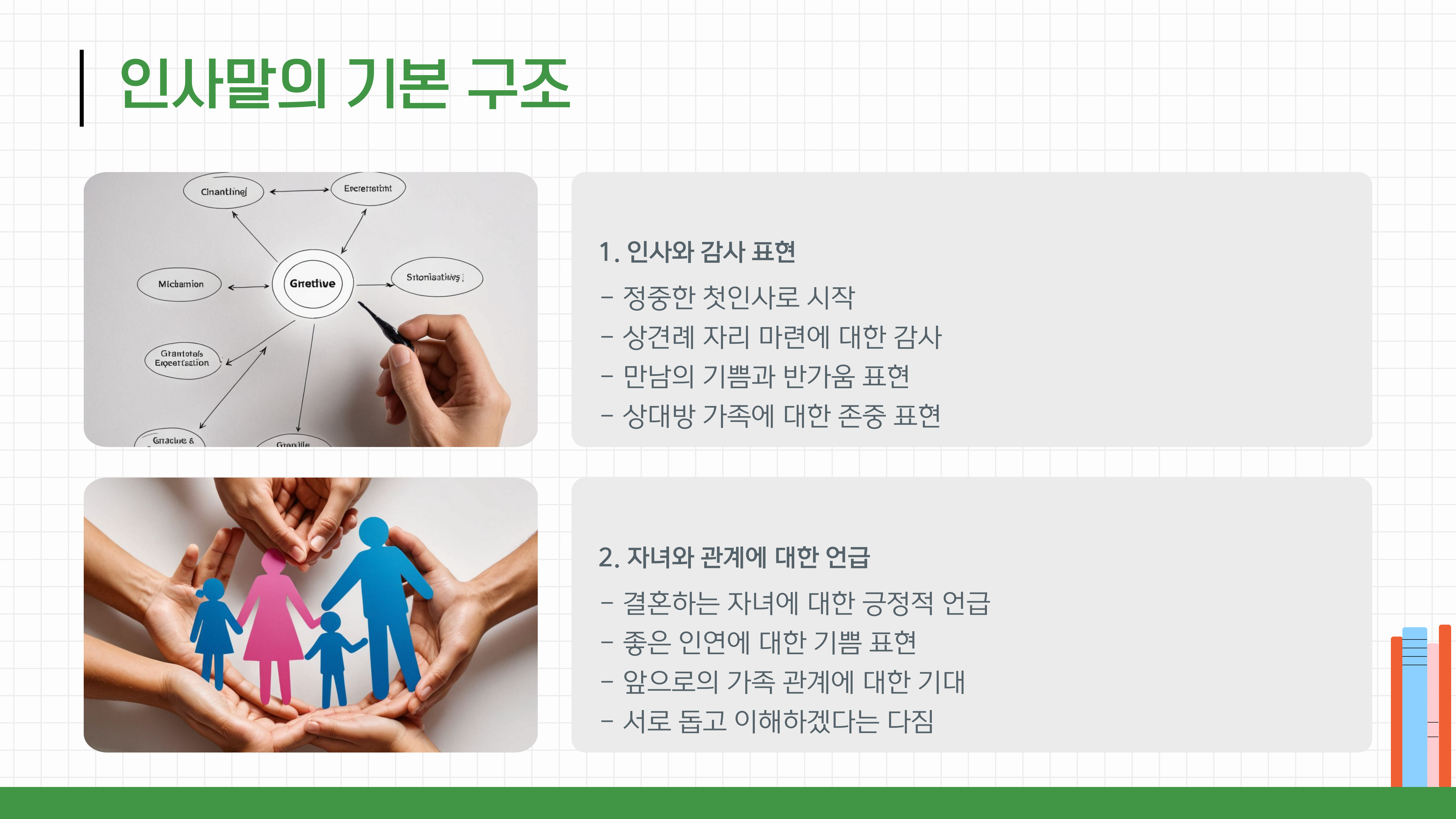 - 좋은 첫인상 만들기: 인사말은 상대방 가족에게 좋은 인상을 주는 중요한 요소이므로, 예의를 갖추고 정중한 태도로 준비해야 합니다.