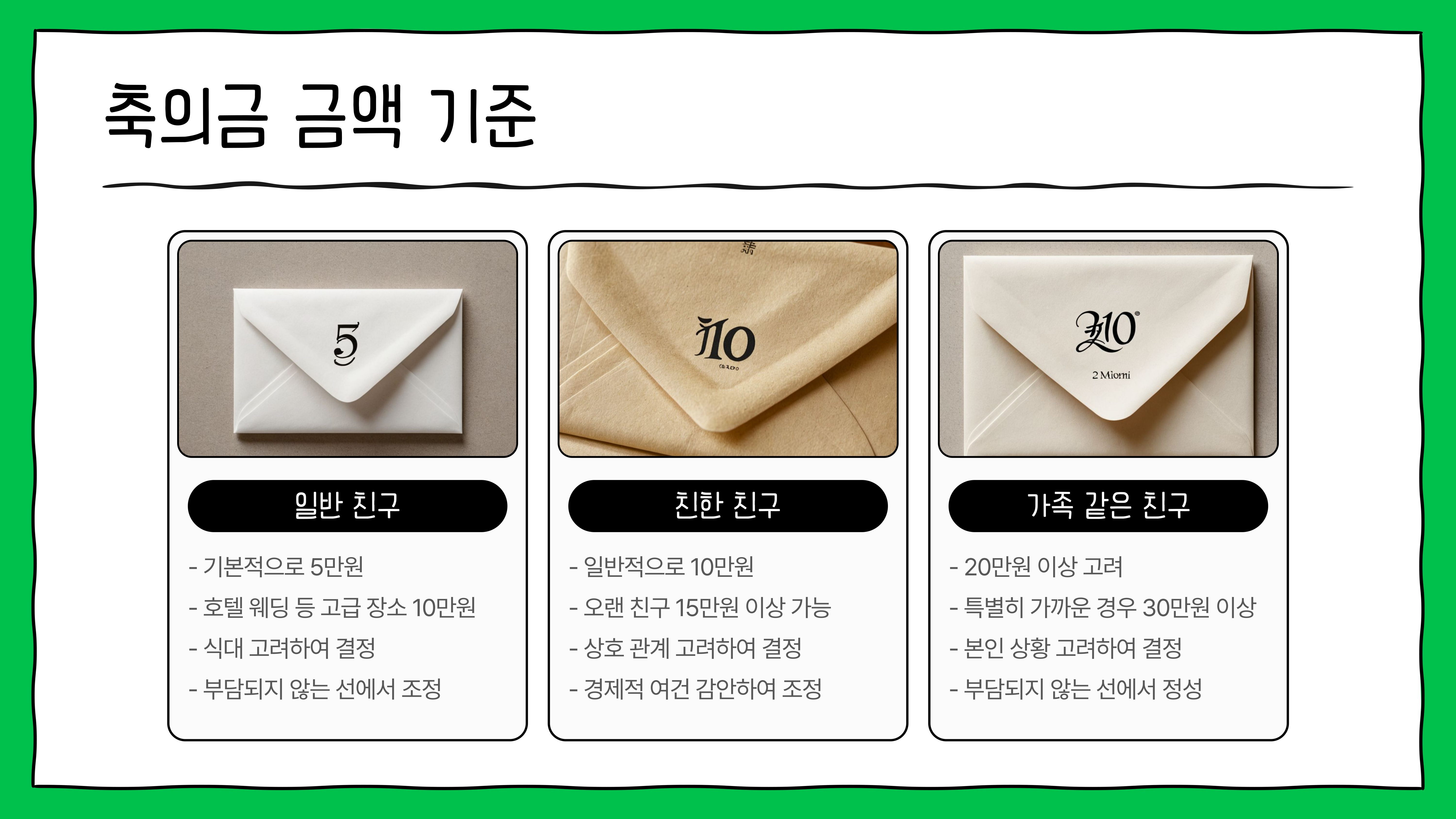 - 관계와 친밀도에 따라 금액이 달라진다: 결혼식 축의금은 정해진 규칙이 있는 것은 아니지만, 일반적으로 친밀도가 중요한 기준이 됩니다.