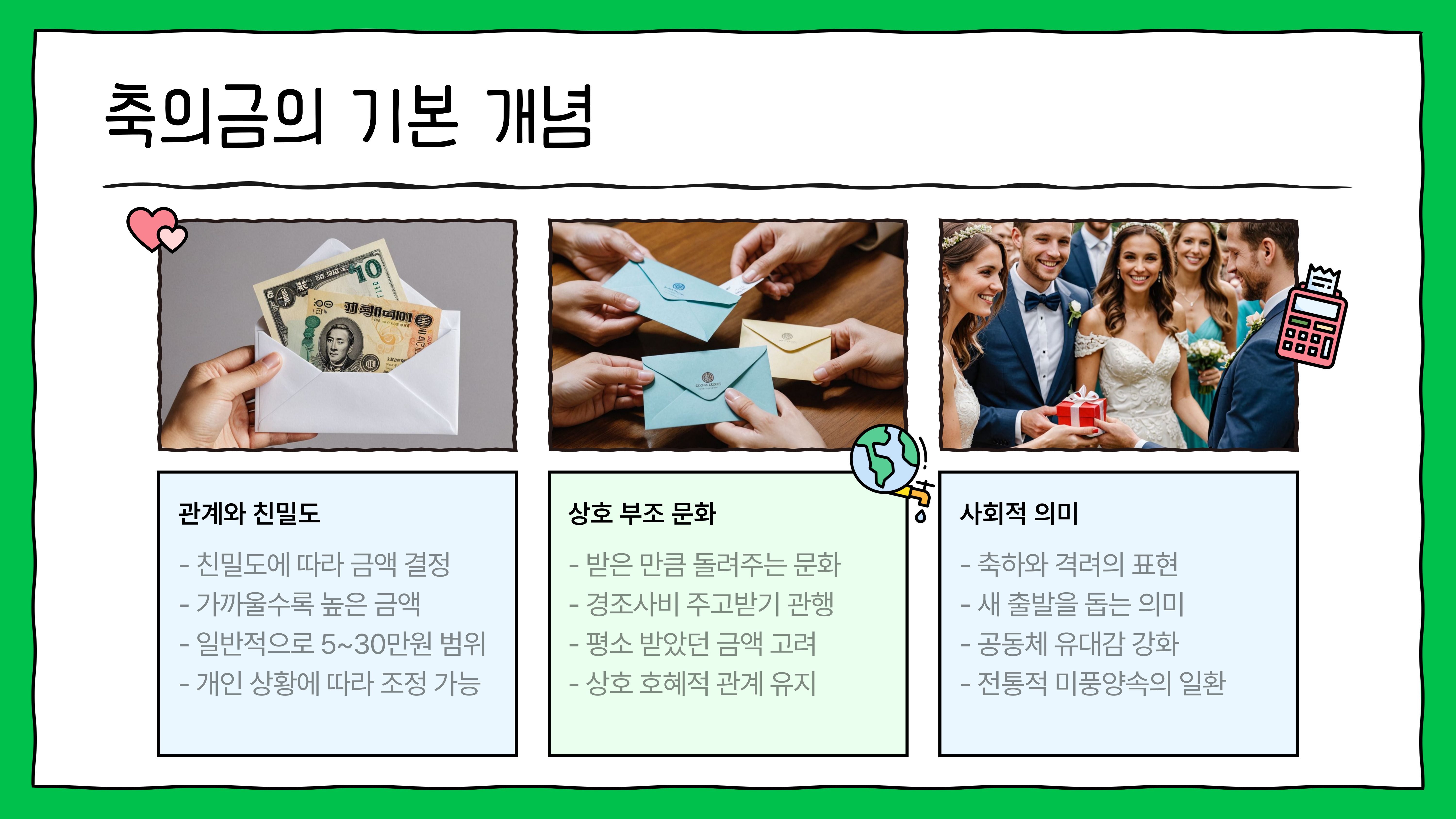 - 받은 만큼 돌려주는 문화: 우리나라에서는 경조사비를 주고받는 문화가 있기 때문에, 평소 내가 받았던 축의금 수준을 고려하는 것이 일반적입니다.