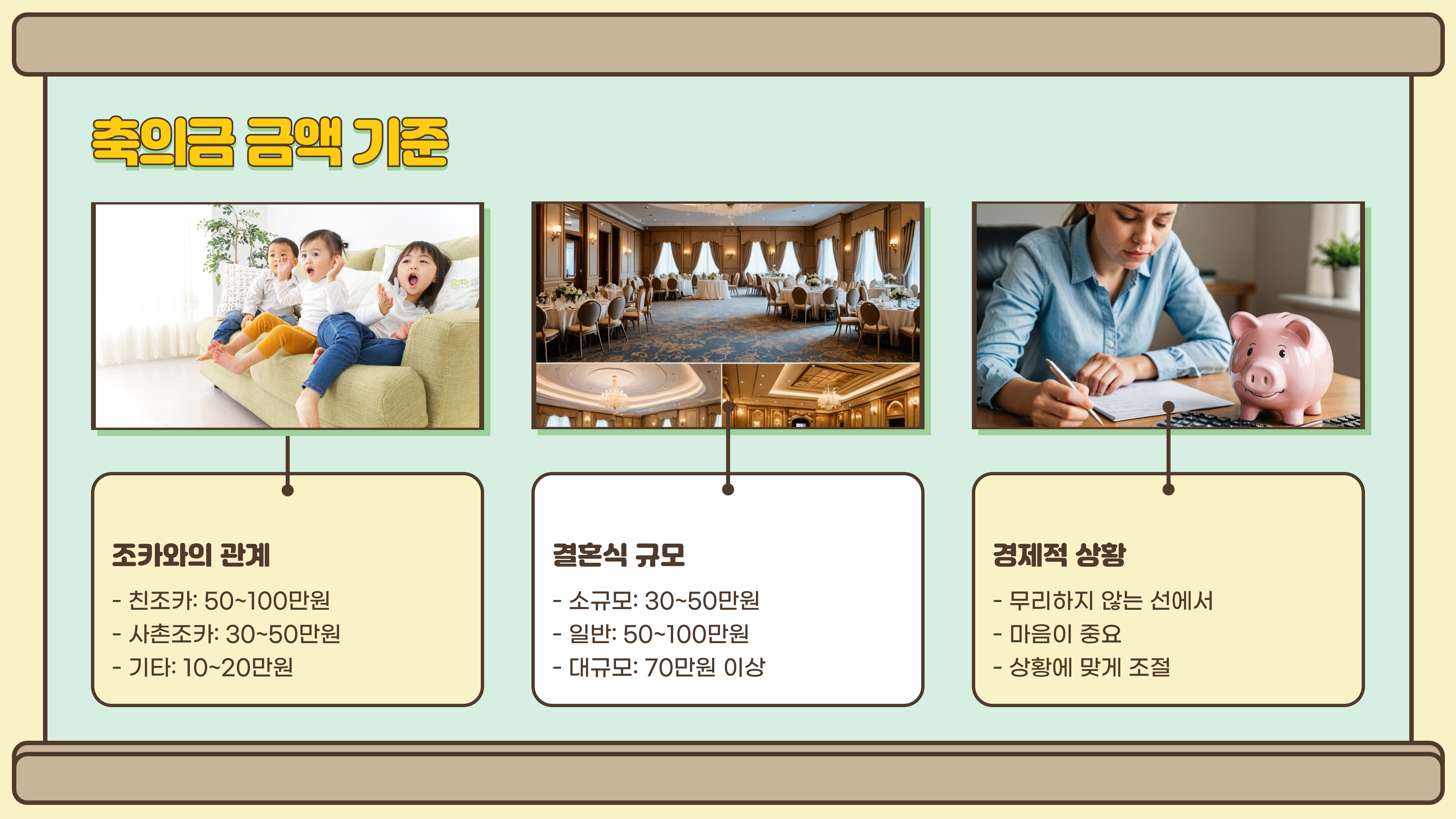- 결혼식 규모: 결혼식이 대규모로 진행될 경우, 축의금도 조금 더 여유롭게 준비하는 것이 예의일 수 있습니다.