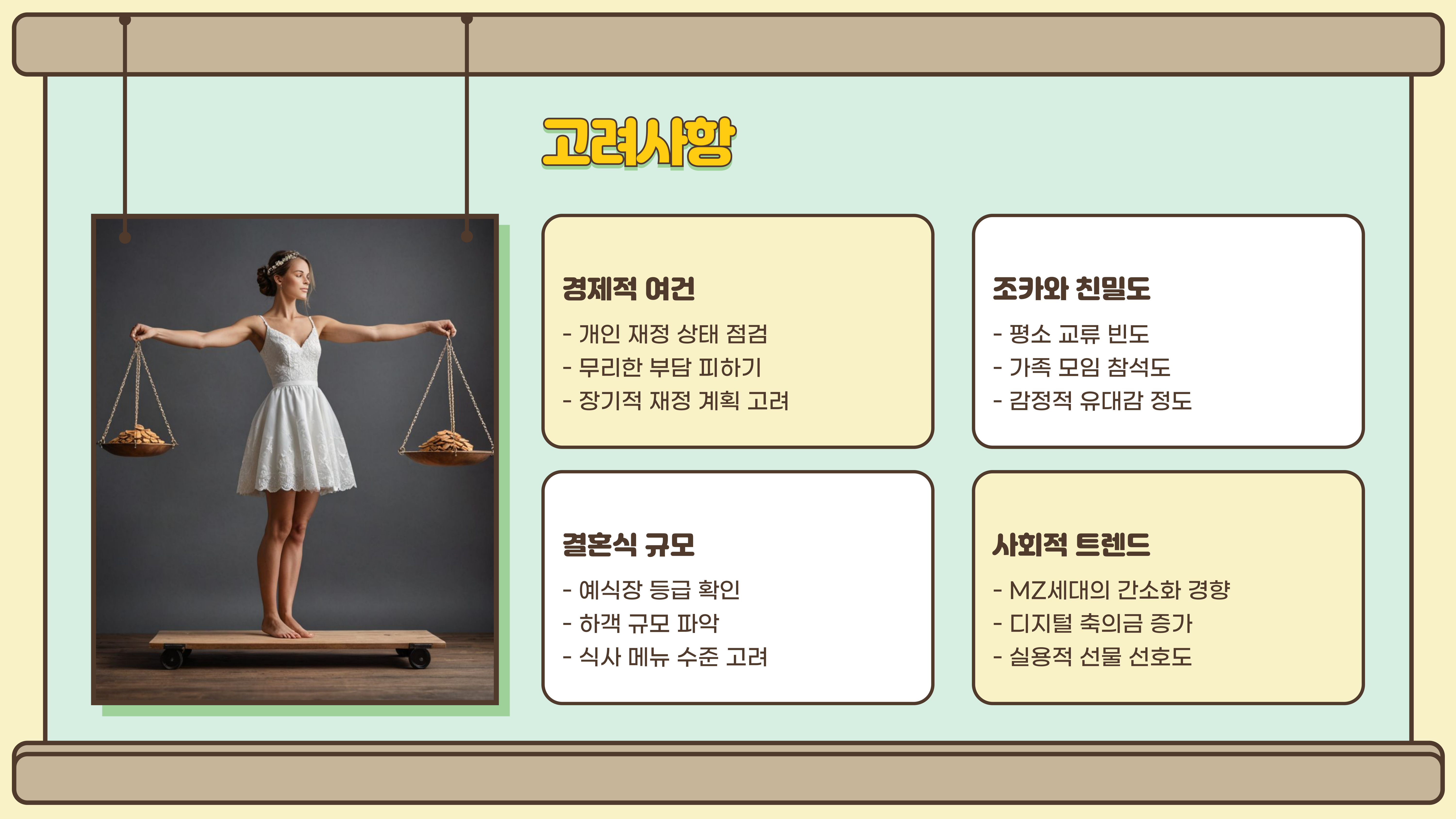 - 경제적 여건: 본인의 상황을 고려하여 무리하지 않는 선에서 준비하는 것이 중요합니다.