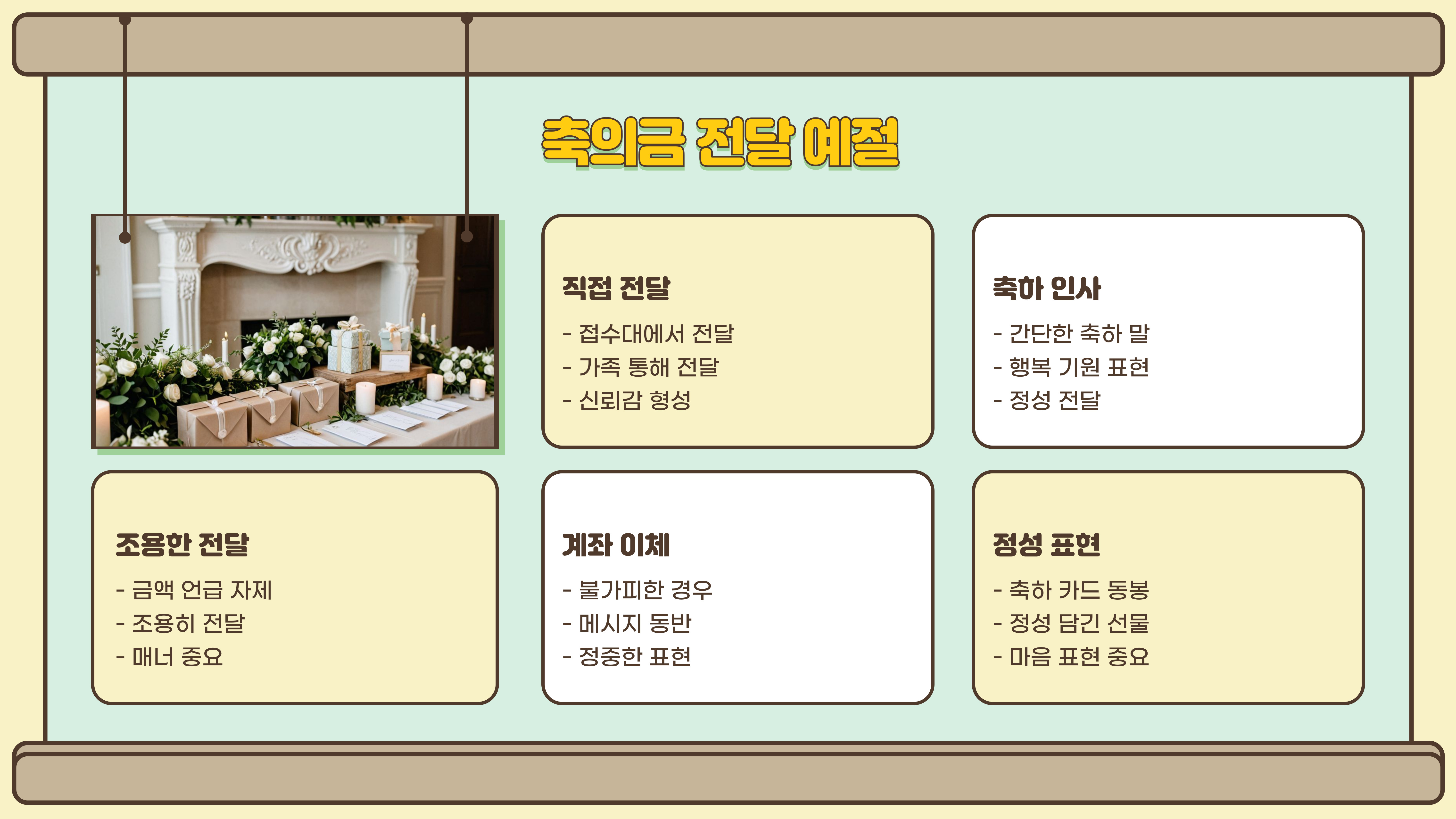 - 축의금을 전달하면서 간단한 축하 인사를 함께 전하면 더욱 정성스러워 보입니다.