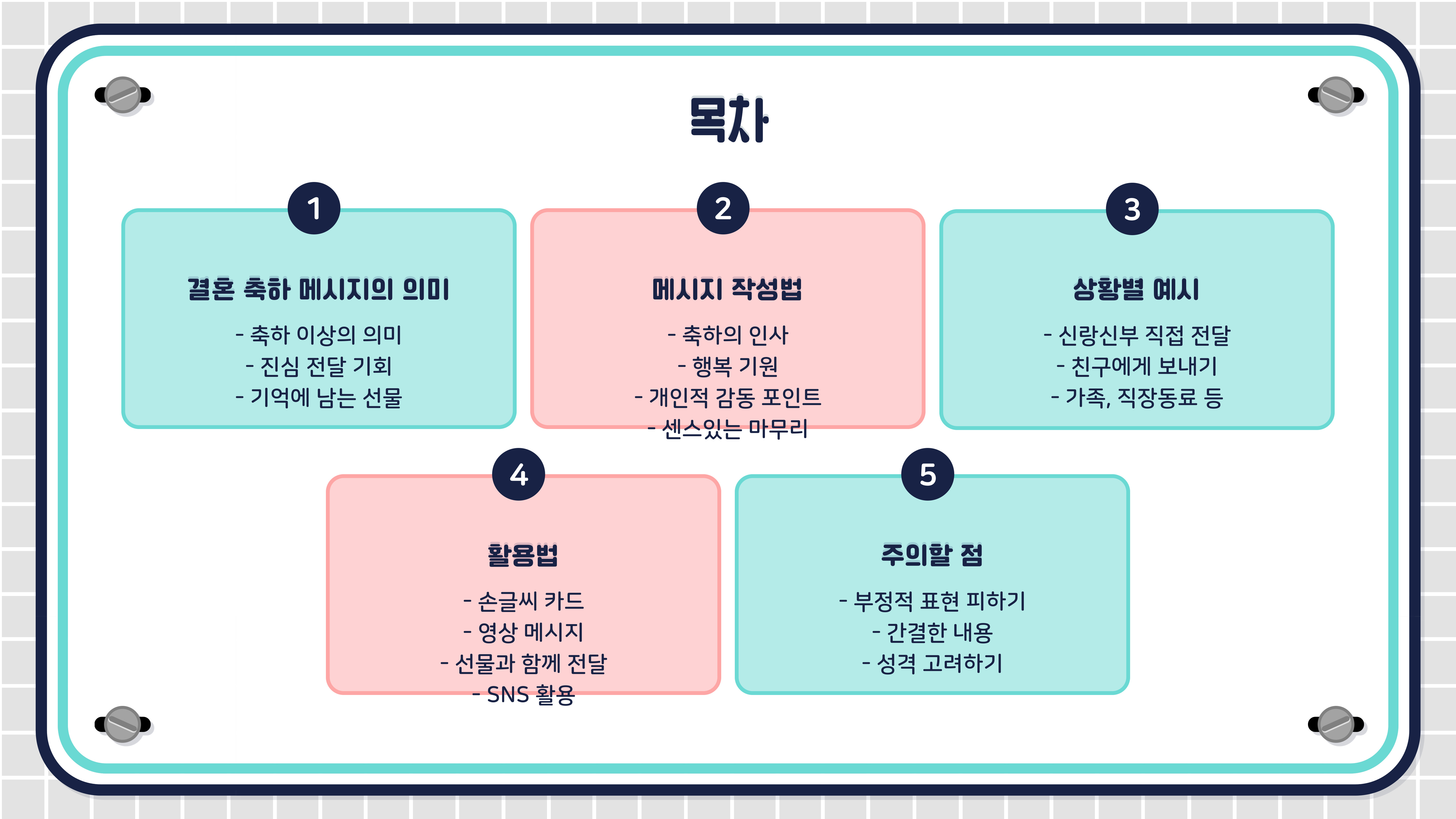 - 신랑·신부의 성격 고려: 유머가 어울리는지, 격식을 차리는 것이 더 좋은지 신중하게 선택하세요.